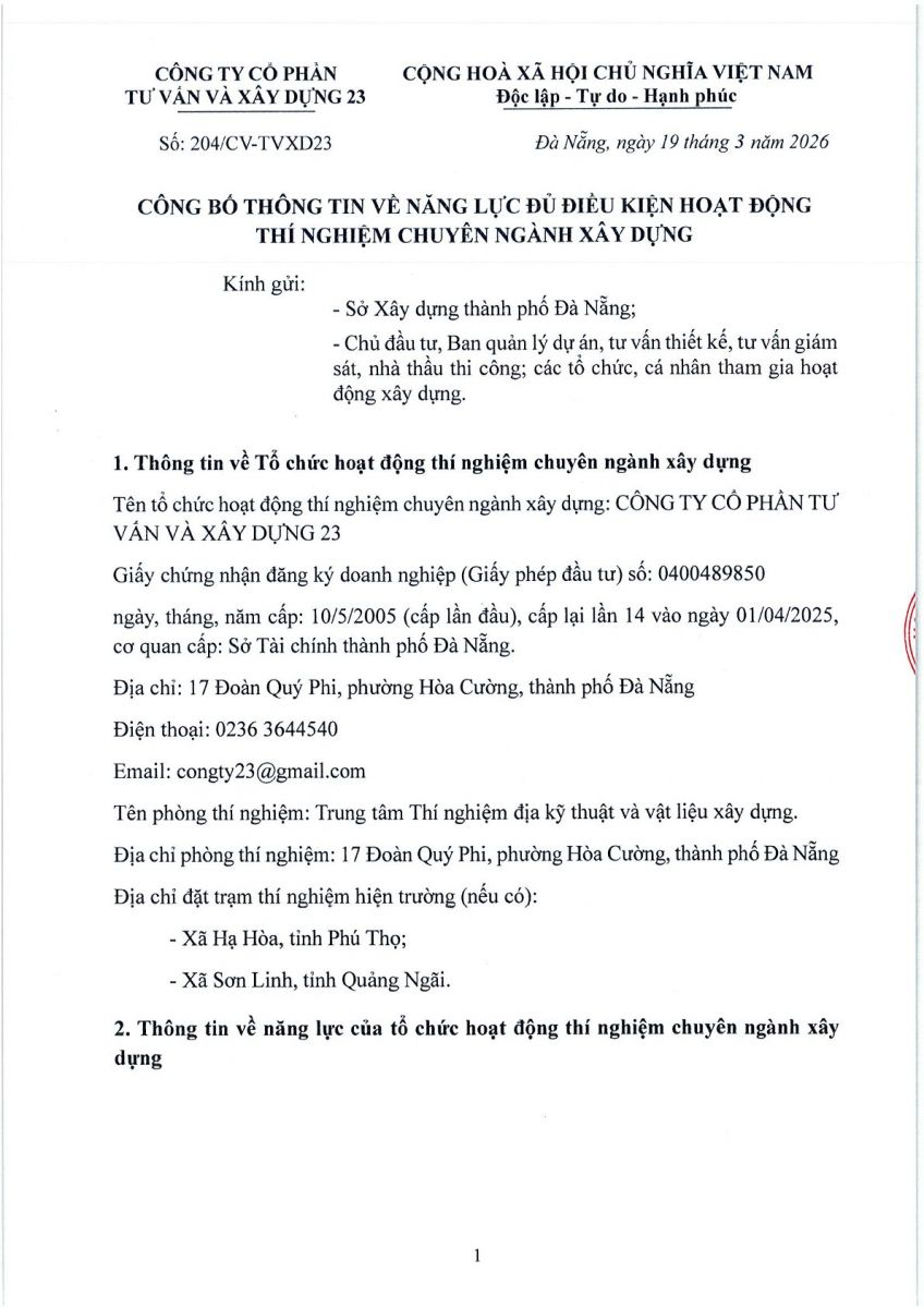 Công ty Cổ phần Tư vấn và Xây dựng 23 trân trọng công bố thông tin về năng lực hoạt động thí nghiệm chuyên ngành xây dựng như sau: