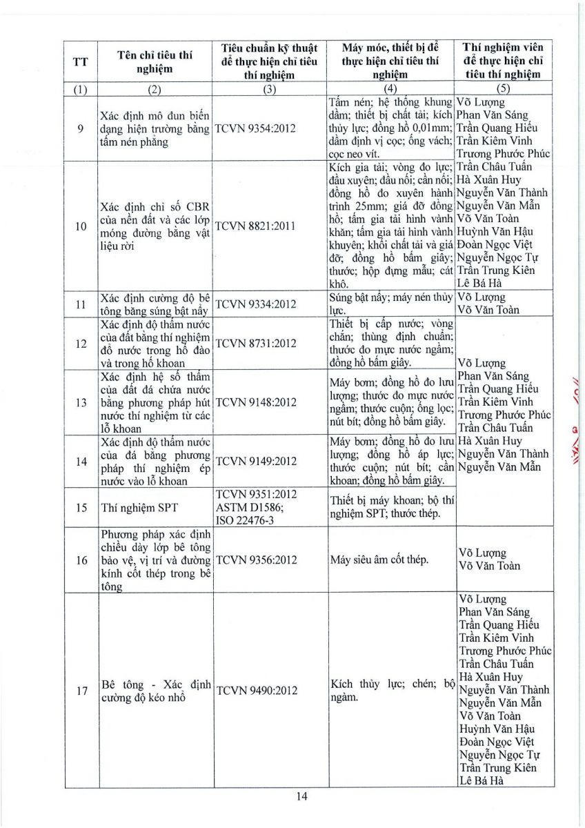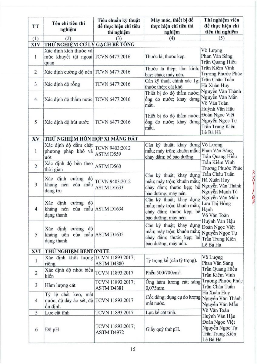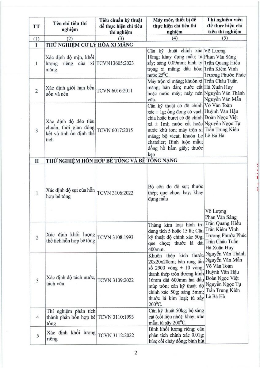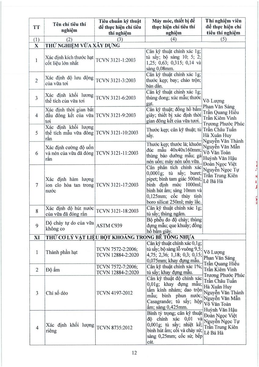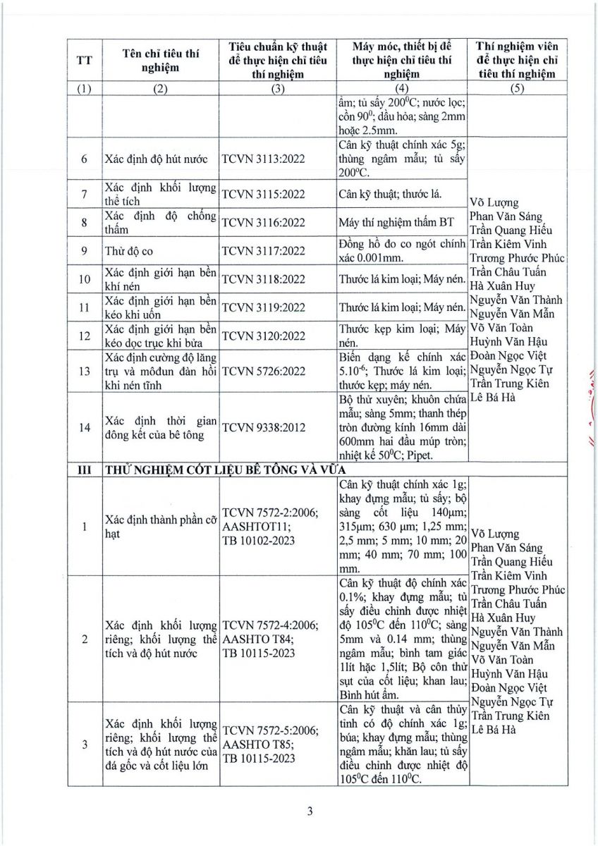 3. Thông tin công bố năng lực hoạt động thí nghiệm chuyên ngành xây dựng