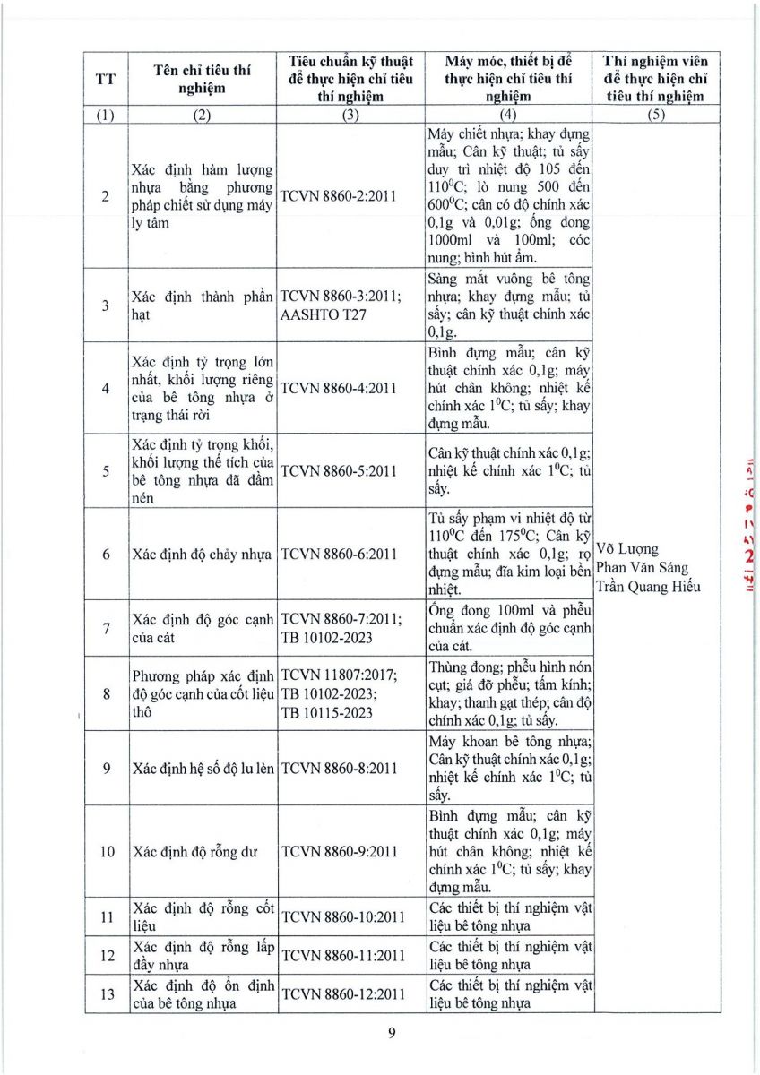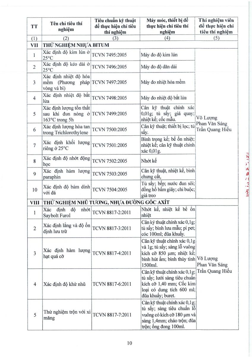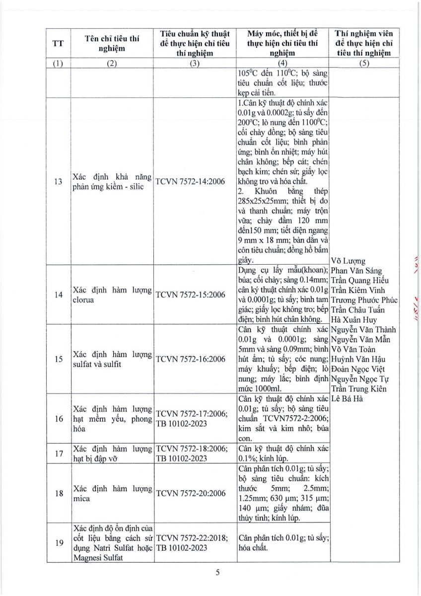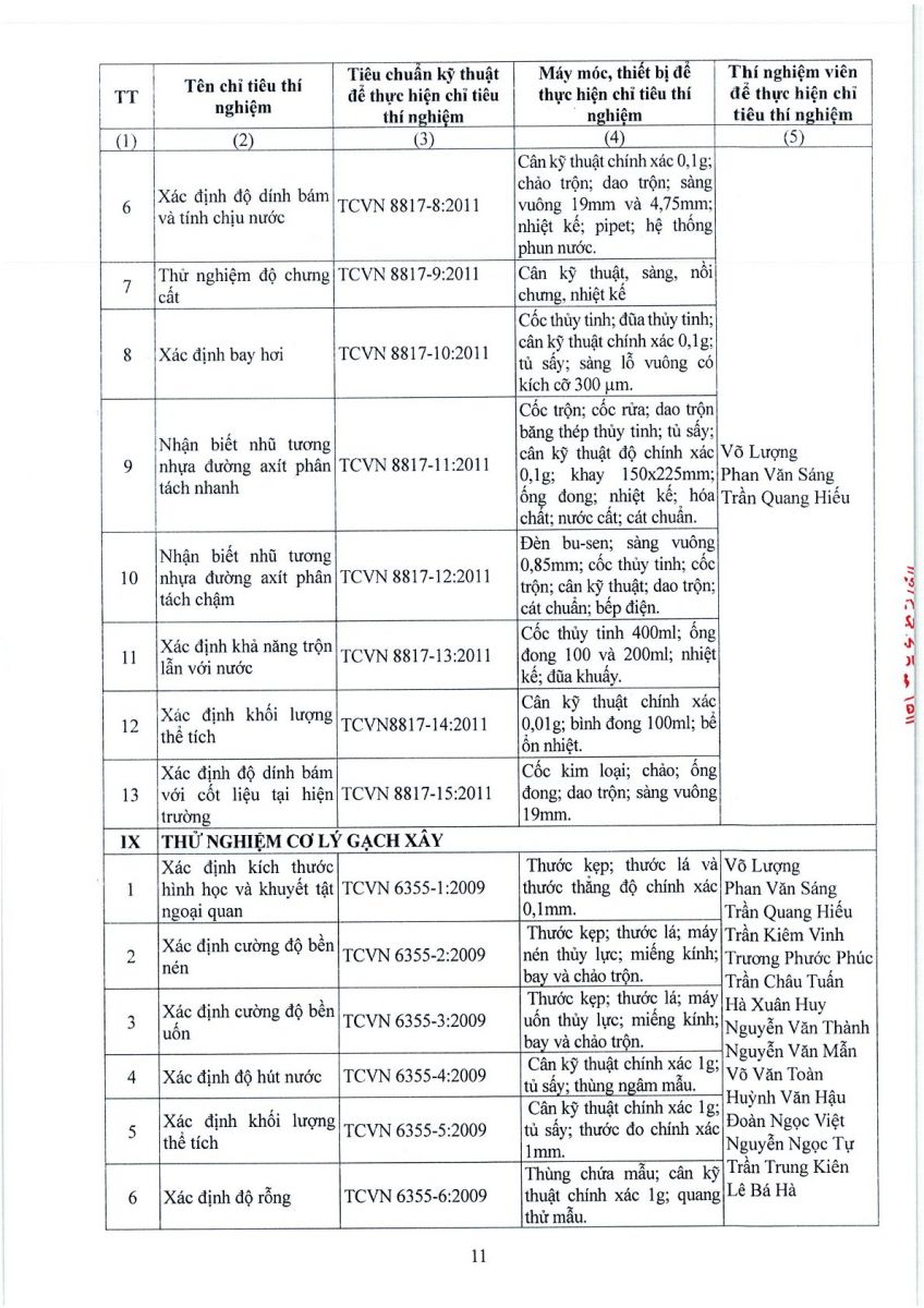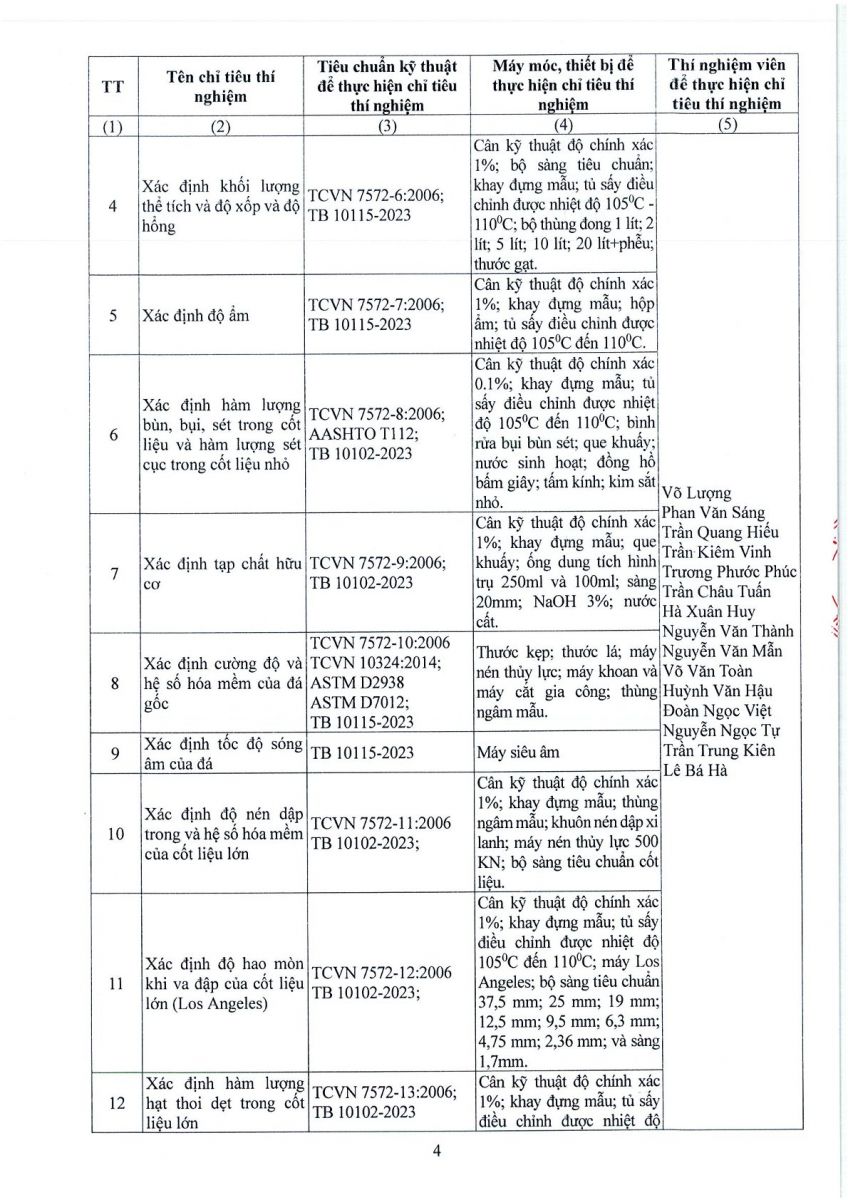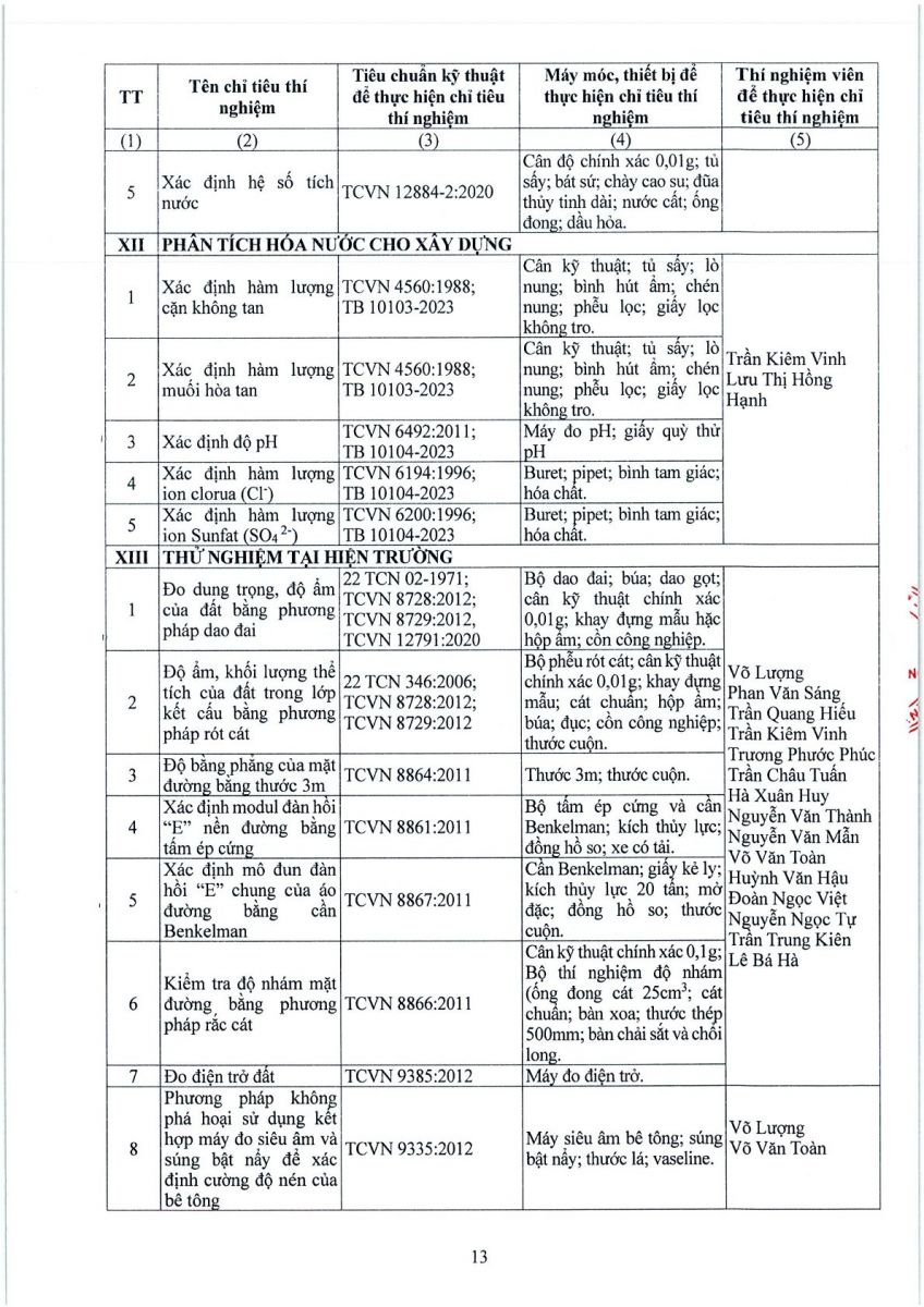 3. Thông tin công bố năng lực hoạt động thí nghiệm chuyên ngành xây dựng