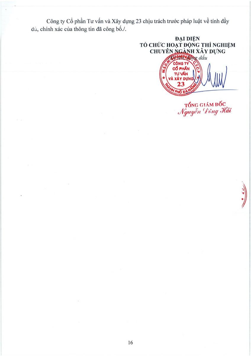 - Tên tổ chức hoạt động thí nghiệm chuyên ngành xây dựng: CÔNG TY CỔ PHẦN TƯ VẤN VÀ XÂY DỰNG 23